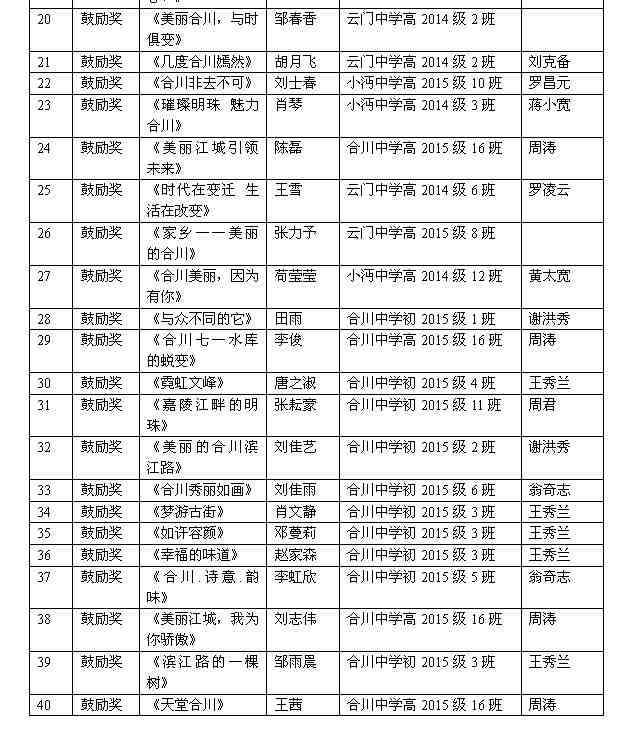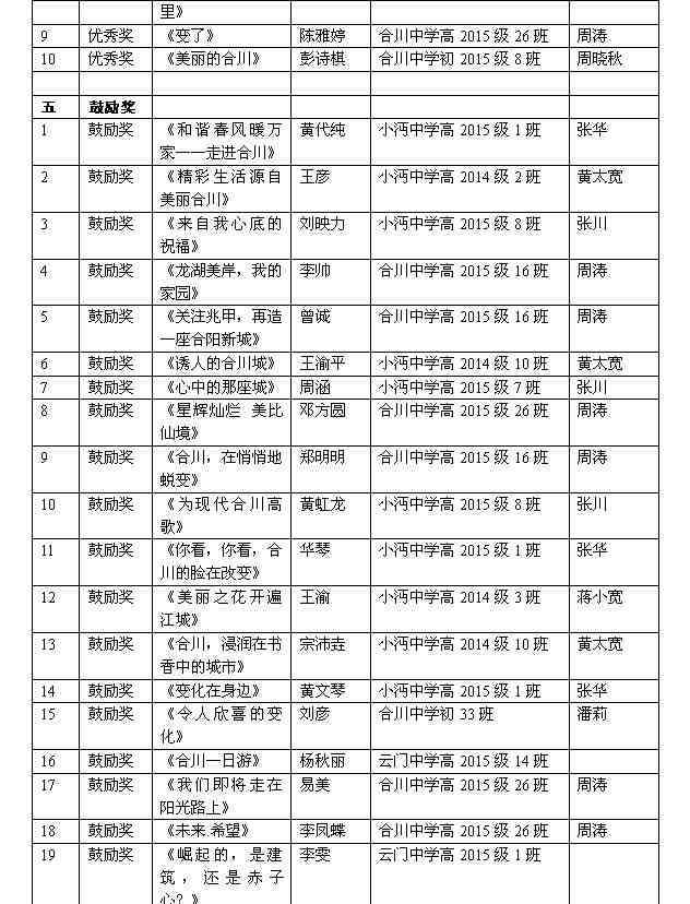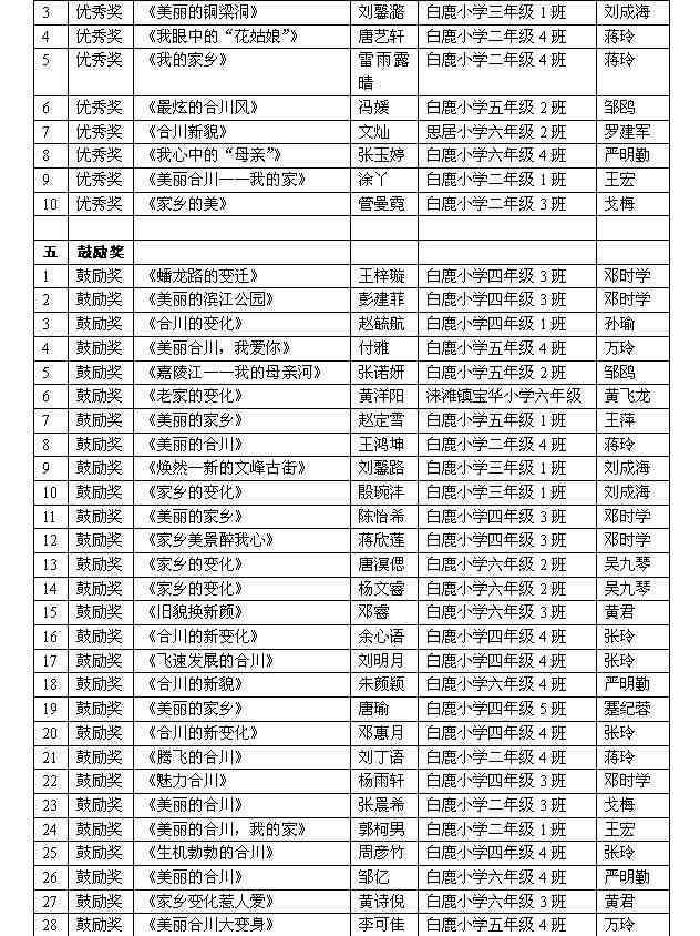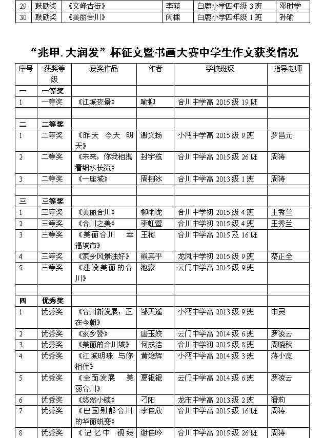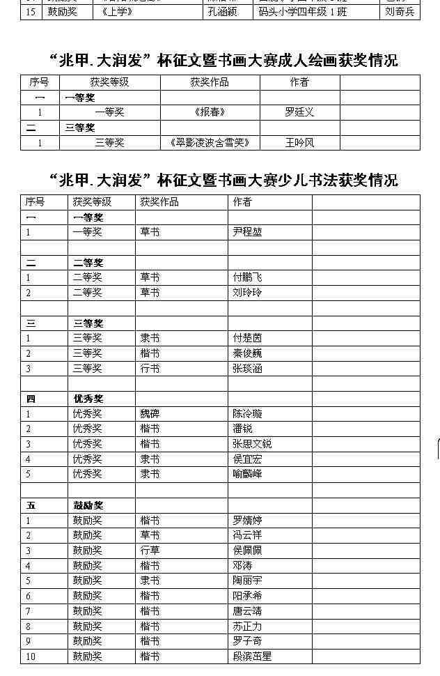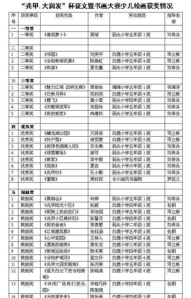 杨应魁参赛作品《草书》荣获成人组书法一等奖,罗廷义参赛作品《报春》荣获成人组绘画一等奖,喻柳参赛作文《江城夜景》荣获中学组征文一等奖,尹程坤参赛作品《草书》荣获少儿组书法一等奖,周斌参赛作品《青坝罗卜》荣获少儿组绘画一等奖,阕楷文参赛作文《舌尖上的合川》荣获小学组征文一等奖。