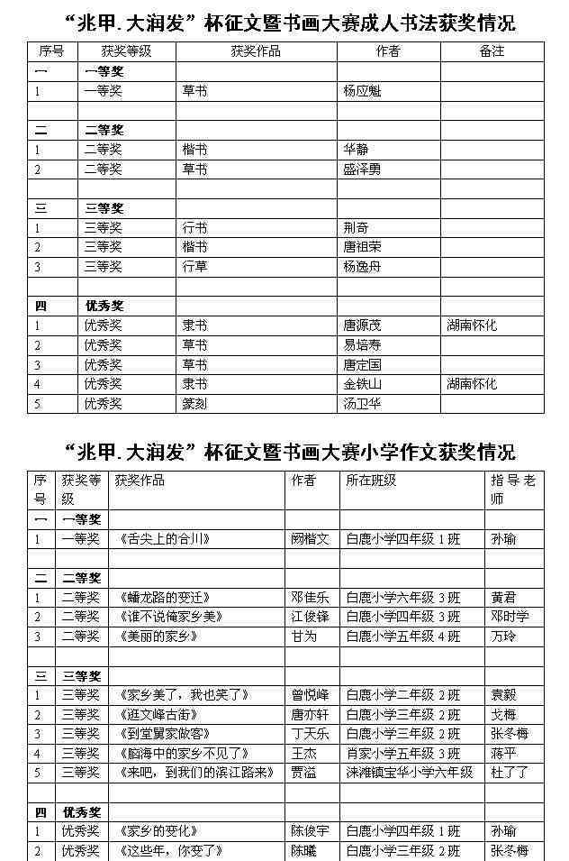 整个活动共收到中学生作文600余篇,少儿、成人书画作品300余件,其中有4件来自湖南怀化的书画作品参赛。除每个项目评选出一、二、三等奖和优秀奖、鼓励奖外,大赛还评出了组织奖。其中,合川中学、白鹿小学、合川渝风书画院荣获组织一等奖,合川区书协、云门中学、小沔中学荣获组织二等奖,龙市中学、码头小学、狮滩小学荣获组织三等奖。