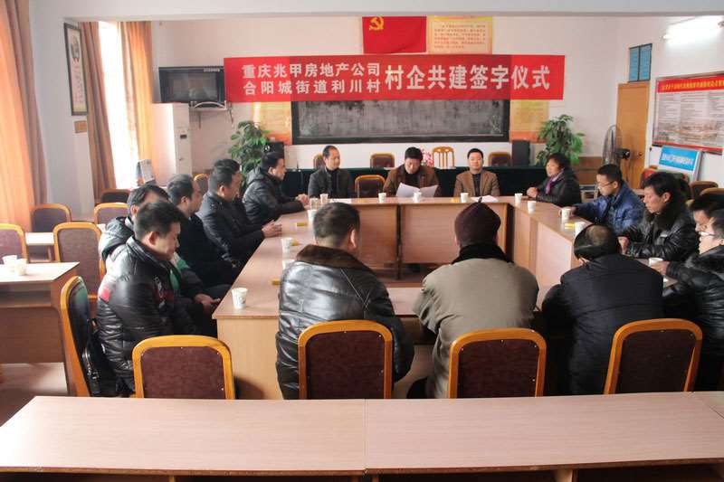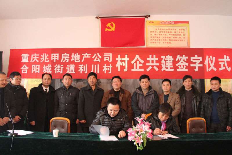 12月29日,重庆兆甲房地产开发有限公司(以下简称“兆甲房产”)与合川区合阳城街道利川村村企共建协议在利川村举行。区委办、区委督查室、合阳城街道、党的十八精神大宣讲活动利川村工作组等相关单位负责人出席签字仪式。