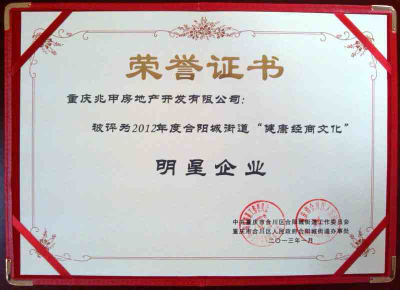 2013年春节来临之际,重庆兆甲房地产开发有限公司(以下简称我司)可谓捷报频传,在刚被合川区房协评为合川区首届诚信房地产企业之后,1月25日,又从合阳城街道办事处传来喜迅,我司以健康的经商理念和诚信的企业文化荣获合阳城街道“健康经商文化明星企业”称号。