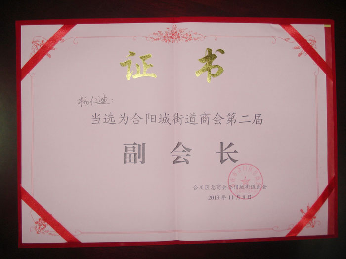 本报讯 近日,笔者从合阳城街道办事处获悉,合川区总商会合阳城街道商会第二届代表大会在锦城宾馆召开,会上,重庆兆甲房地产开发有限公司(以下简称兆甲房产)当选为副会长单位,杨仁迪总经理当选为商会副会长。