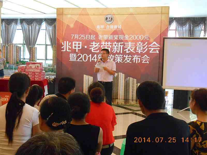 当日下午14时许,在业主们热烈的掌声中,兆甲·2014夏季老带新表彰会暨新政策发布会正式拉开帷幕。表彰会上,兆甲·合阳新城企划部代涛首先代表兆甲房产对各位新老业主表达了谢意,同时,他也对兆甲·合阳新城新的老带新政策进行了说明。他表示,老带新优惠政策从2013年11月15日开始执行以来,得到了广大业主朋友的大力支持;现在,为更好的完善老带新制度,经公司研究决定,将于2014年7月25日起执行新的老带新激励制度。新的兆甲·合阳新城老带新政策执行时间从2014年7月25日至2015年 7月24日,老带新政策范围包括兆甲.合阳新城在售的龙湖美岸、海润国际、滨江国际项目的住宅部分;老带新客户购买项目住房,签订购房合同完成按揭抵押后,即可回馈2000元现金。自此,兆甲·合阳新城全城营销模式正式启动,这也将为今年夏日的合川楼市注入新动力。