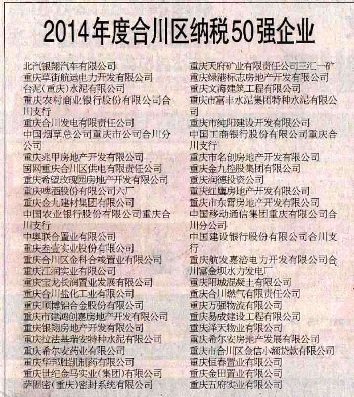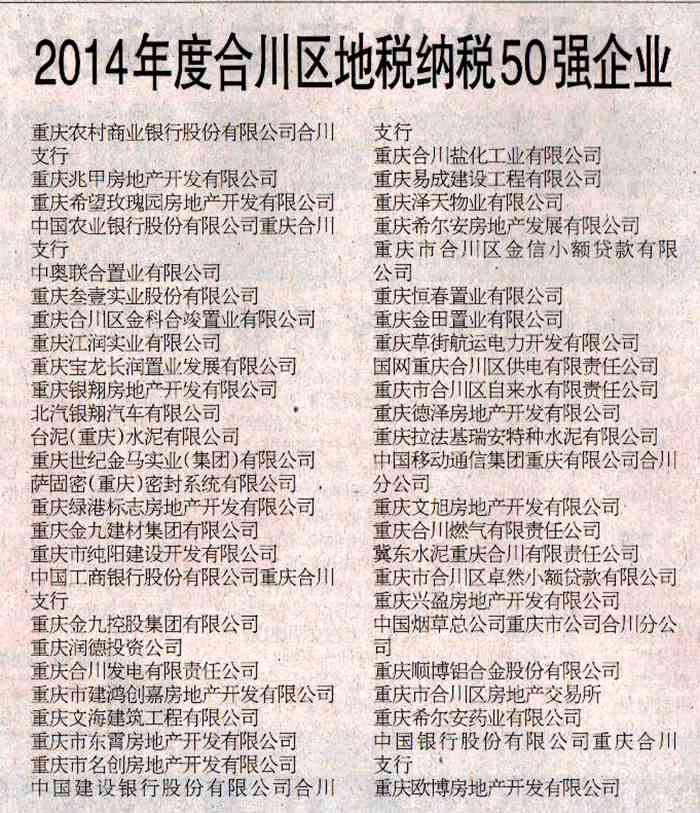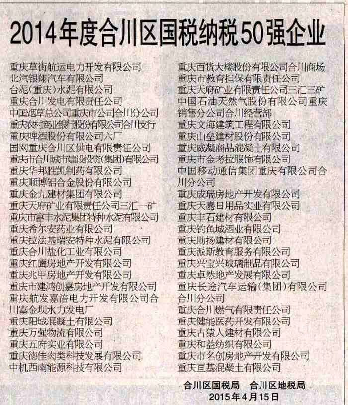 本报讯 4月15日,合川区国税局、合川区地税局通过《合川日报》对外发布了2014年度合川区纳税50强企业榜单(包括地税50强、国税50强),兆甲房产继2013年度获得合川区纳税十强之后,再次名列综合排名前十强,地税排名第二名。