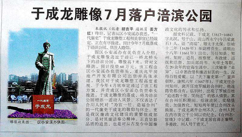 兆甲房产承建的“于成龙雕像”方案确定 7月落成供合川市民瞻仰