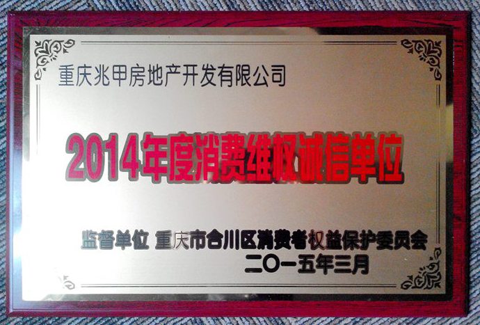 本报讯 近日,笔者从公司行政人事部获悉,经重庆市合川区消费者权益保护委员会严格审核及评定,重庆兆甲房地产开发有限公司从众多企业中脱颖而出,荣获合川区“2014年度消费维权诚信单位”称号。