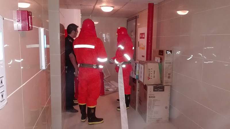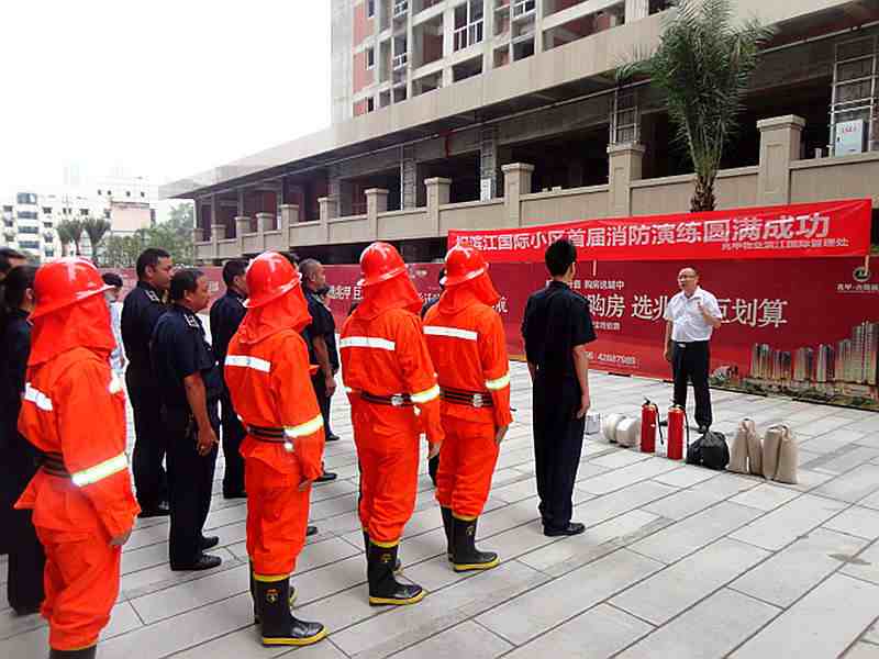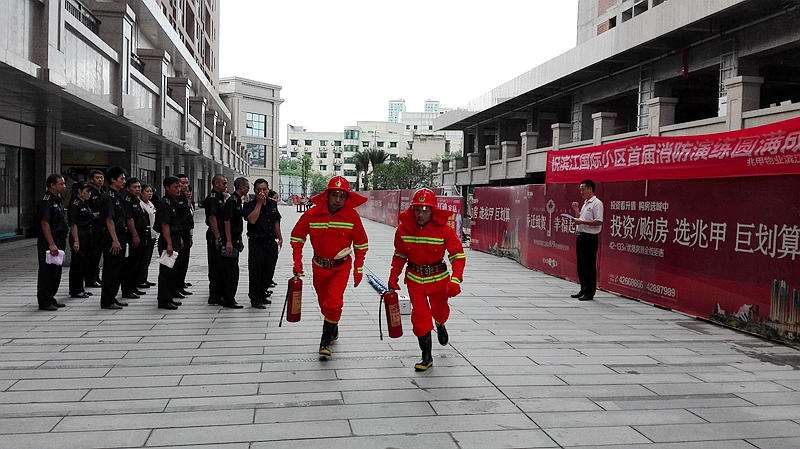 很快,时间来到了下午15:09分,现场指挥郑伟发布紧急命令:“各组注意:接监控中心报告,9号楼4层公区过道发生火灾,现立即启动消防应急预案”。话音刚落,各组便快速展开行动,工程保障组立即关闭9号楼电、气源,电梯迫降至一楼,消防泵房、发电机房人员就位,消防应急疏散广播开启,灭火组火速到达现场,连接消防水带和使用灭火器灭火,疏散组负责人员、物资疏散,警戒组好现场秩序,并做好业主解释工作,而救援组则原地待命,随时支援疏散组人员……