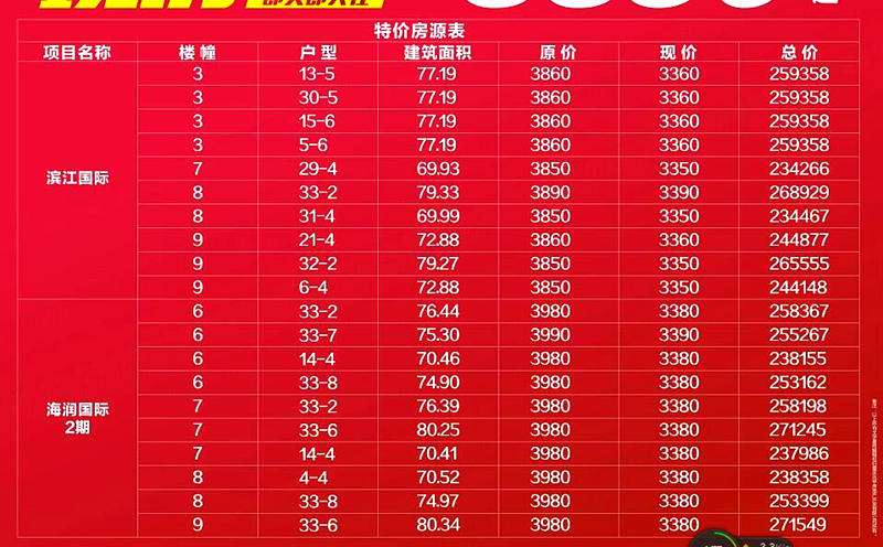 在本次活动中,兆甲房产拿出滨江国际和海润国际部分房源,以折后价3350元/平米的震撼价格对外发售,这些房源大多为面积为70-80平米左右的经典两房,总价低,配套好,最低低至23万,而且又是现房,即买即入住,确实令人心动。
