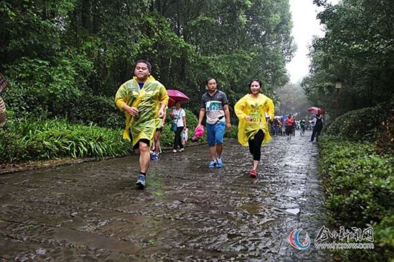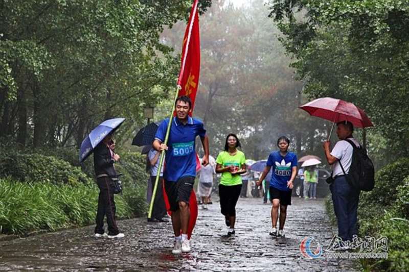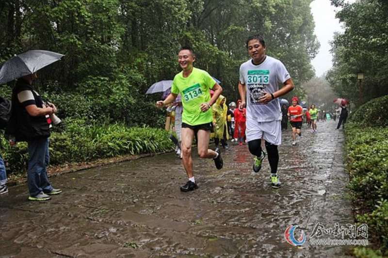 (图为运动员们在冒雨奔跑)