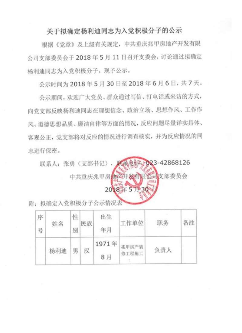 关于拟确定杨利迪同志为入党积极分子的公示