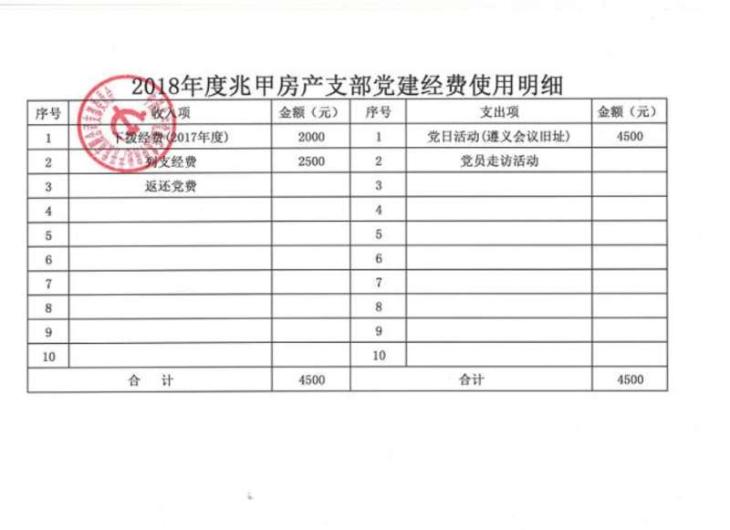 兆甲党支部2018年度党建经费收入及使用明细公示