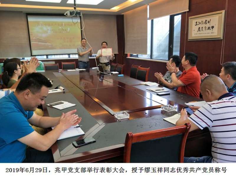 “兆甲房产党支部”为庆祝中国共产党建党98周年,2019年6月29日在党支部活动室举行迎“七一”表彰会,授予缪玉祥同志优秀共产党员称号。