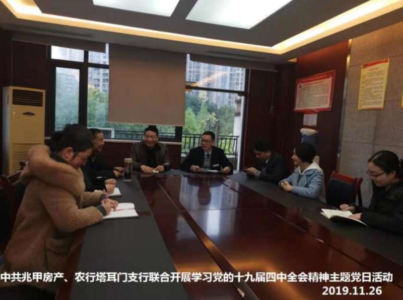 (通讯员 缪玉祥)2019年11月26日,中共重庆兆甲房地产开发有限公司、合川农行塔耳门支行党支部组织全体党员联合开展主题党日活动,学习党的十九届四中全会精神。