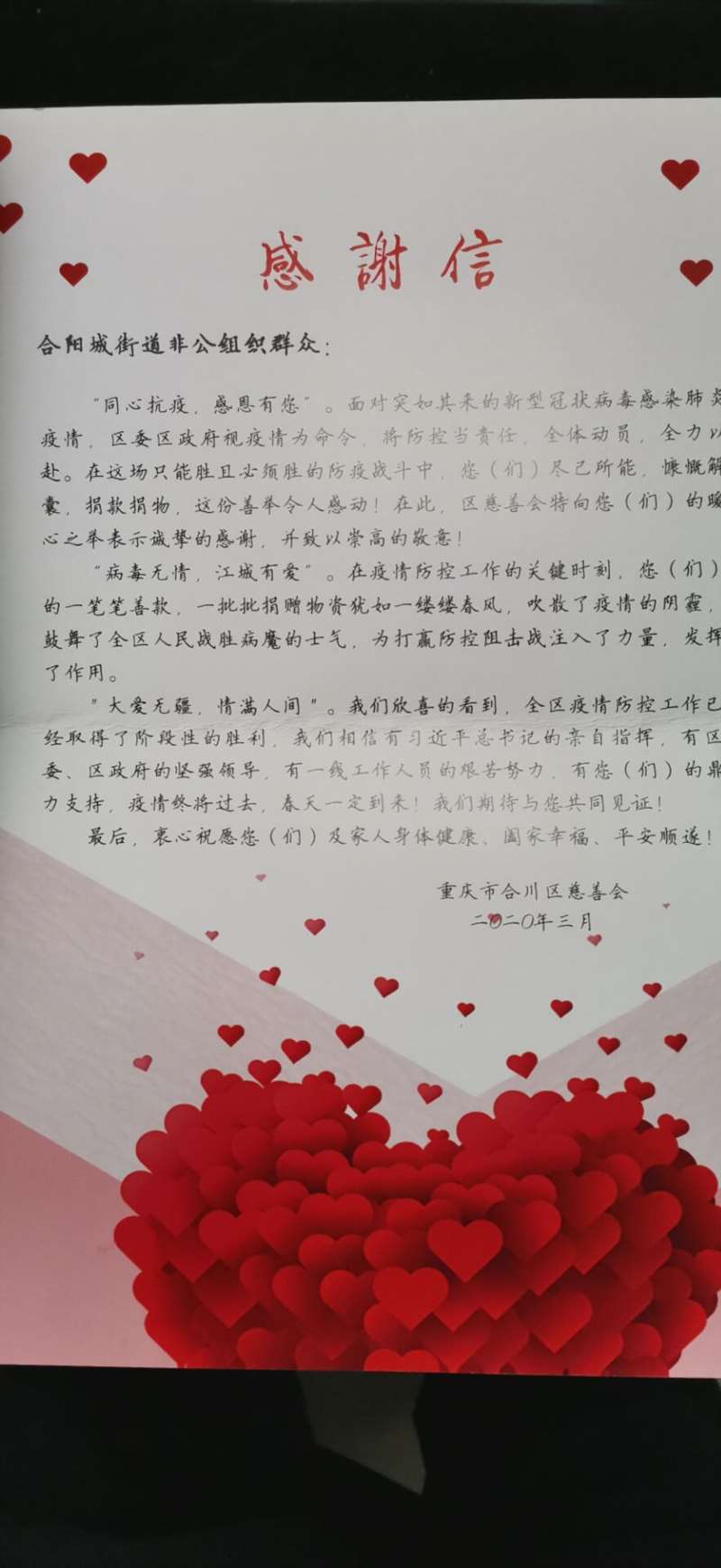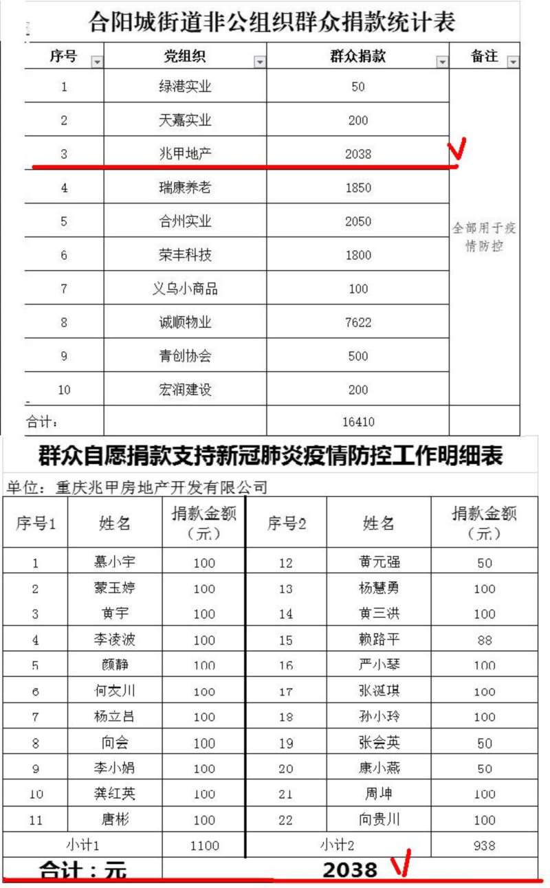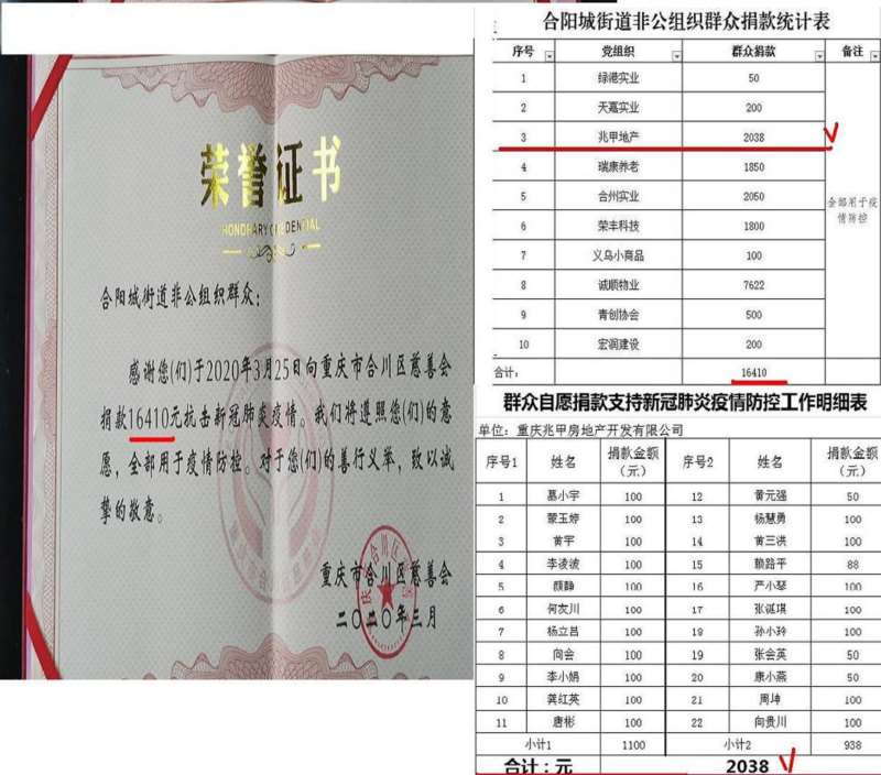 为支援打赢抗击新冠肺炎疫情阻击战,重庆兆甲房地产开发有限公司员工群众踊跃捐款,现转达“重庆市合川区慈善会”表示的衷心谢意!