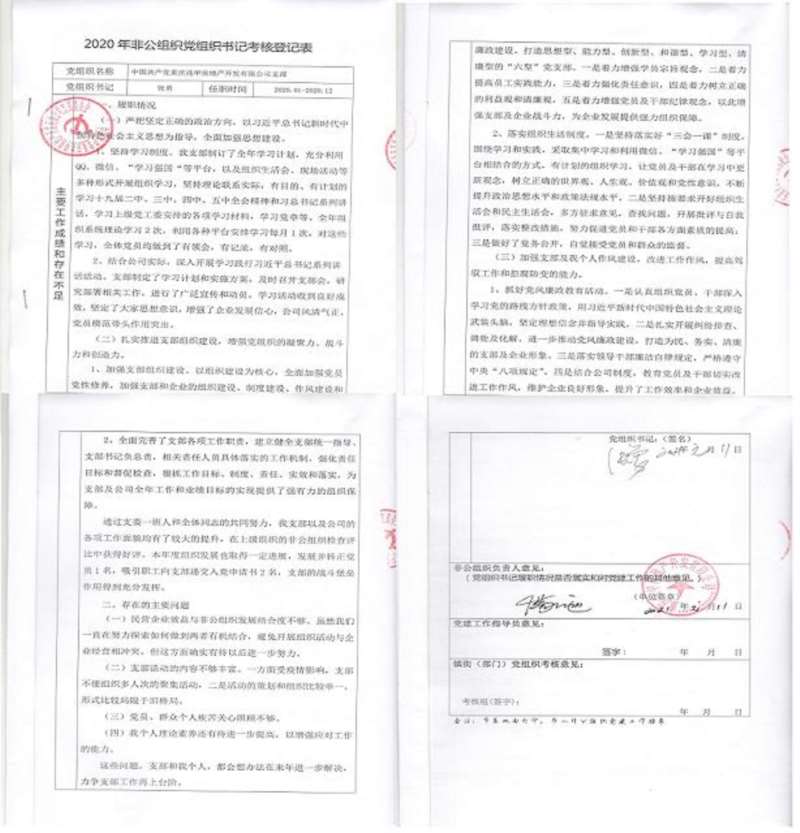 (通讯员 缪玉祥) 2021年1月13日下午,中共“重庆兆甲”党支部书记张勇同志完成并向上级党组织递交《2020年非公组织党组织书记考核登记表》、《抓基层党建工作述职报告》。图1为递交的考核登记表: