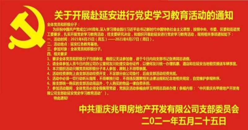 (通讯员 缪玉祥)为庆祝中国共产党成立100周年,中共重庆兆甲房地产开发有限公司党支部党员及入党积极分子,在合阳城街道党群办党建指导员彭玲、符登位两位同志的指导下,2021年6月25至28日赴革命圣地延安开展党史学习教育活动。