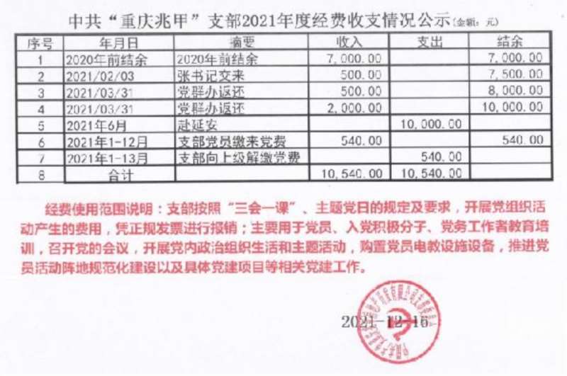 “重庆兆甲”支部2021年度经费收支情况公示如下: