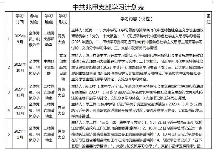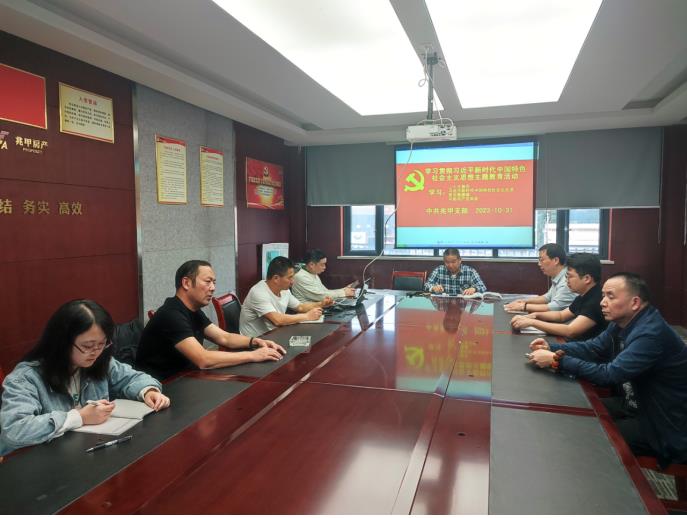2023年10月30日:根据上级按排,中共兆甲支部决定2023年10月31日如开党员大会,现正在开展的是学习习近平新时代中国特色社会主义思想主题教育活动,已将“二十大报告”、“习近平新时代中国特色社会主义思想专题摘编(2023年3月)”2个自学文件及“主题教育学习书籍7本”、至年底的学习计划发表,方便大家学习。2023年10月12日合川区委主题教育联络组一行5人曾来本支部检查主题教育学习情况,以后区委主题教育联络组将对党员学习情况电话联系的检查方式,各位如接到电话,如实反映中共兆甲支部开展主题教育活动的学习形式是网 上、集中学习相结合,学习内容是2个自学文件及“主题教育学习书籍7本”,通过学习掌握基本内容、基本观点、基本要求。检查期间不允许出现电话号码错误或者空号现象,确保党员知晓率100%。随着主题教育活动的深入,开展“立足岗位作贡献”活动,要求党员干部“爱岗敬业”,深入生产一线,在“保证施工进度、保证质量、保交房”活动中起表率作用。