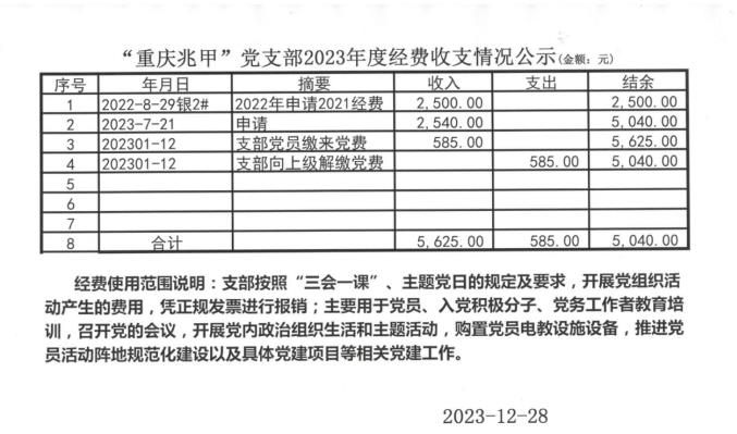 2023-12-28 通讯:2023年度“重庆兆甲”党支部 经费收支情况公示: