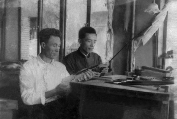 图1:缪志广(右2)在中央音乐学院华东分院乐器制作室的工作照(左1为同事郭树槐)