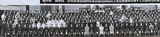 图7:1991年6月14日上午十点钟,在北京京西宾馆,江泽民总书记等党和国家领导人,同出席国防科工委先进集体合影,第1 排左起第21人为江泽民总书记:第5排左起第19人为缪玉珊。